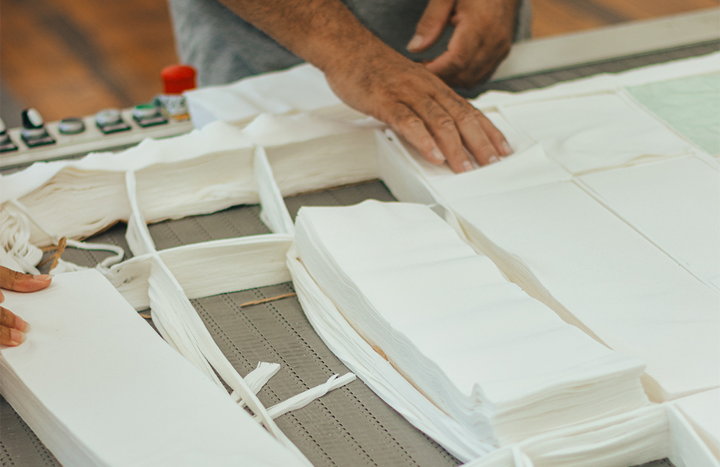 • Acompanhamos o processo produtivo em cada detalhe. Desde a compra do algodão, do fio, até a parte final: a camiseta pronta.